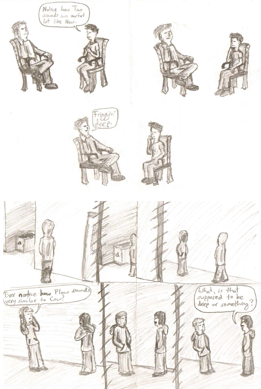 A dream I had I think also in high school, or maybe college. I didn't do a good job making it clear that the big bird is swatting the little birds away so they keep going over the same area on the conveyor belt, but they didn't seem to notice until the end. I don't remember what the actual dialogue was. Don't think too hard about it okay.